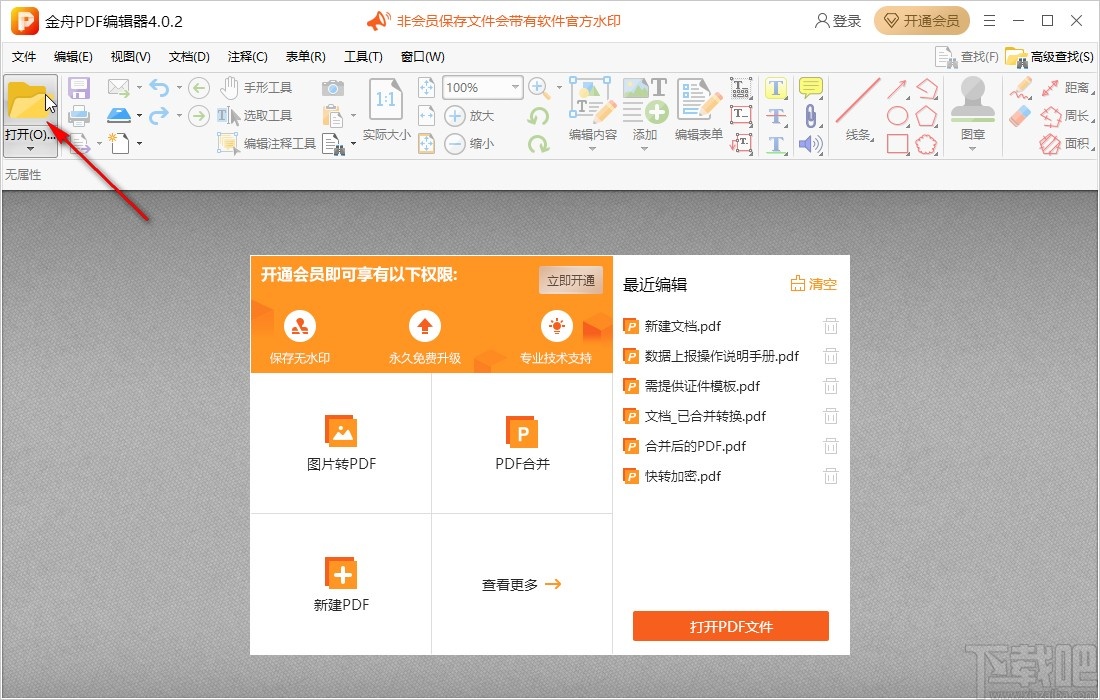 1.首先第一步我们打开软件之后,在软件界面左上角找到打开按钮,点击之后打开选择PDF文件的界面。