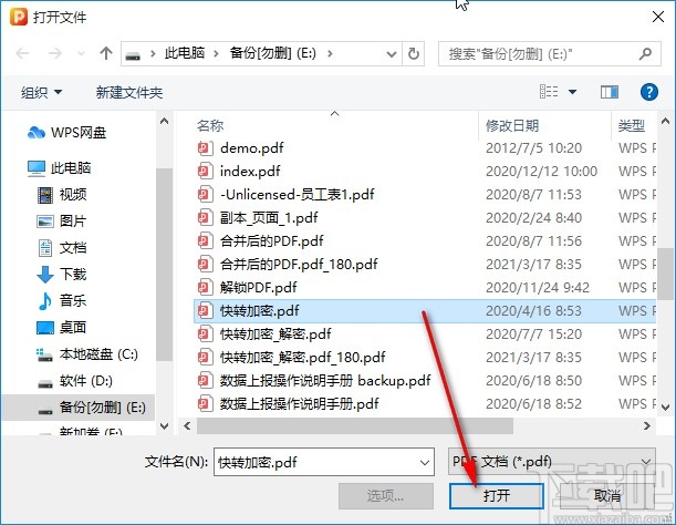 2.下一步我们打开这个选择文件的界面之后,在界面中我们选中目标PDF文件之后点击右下方的打开按钮,如下图中所示。