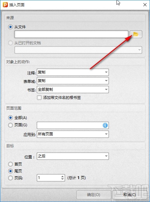 4.接下来打开插入页面的操作面板,选择从文件插入的话点击右边的文件夹图标准备选择想要插入的文件页面。