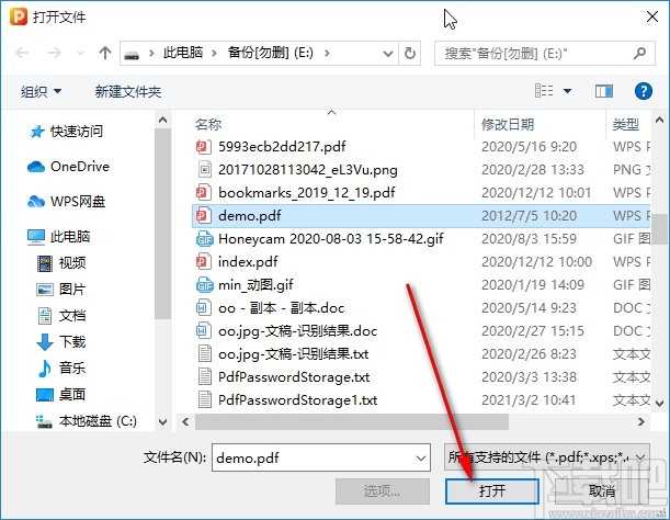 5.点击这个文件夹图标之后接下来就出现一个选择文件的界面了,我们在界面中选中想要插入的PDF文件,点击右下方的打开按钮。
