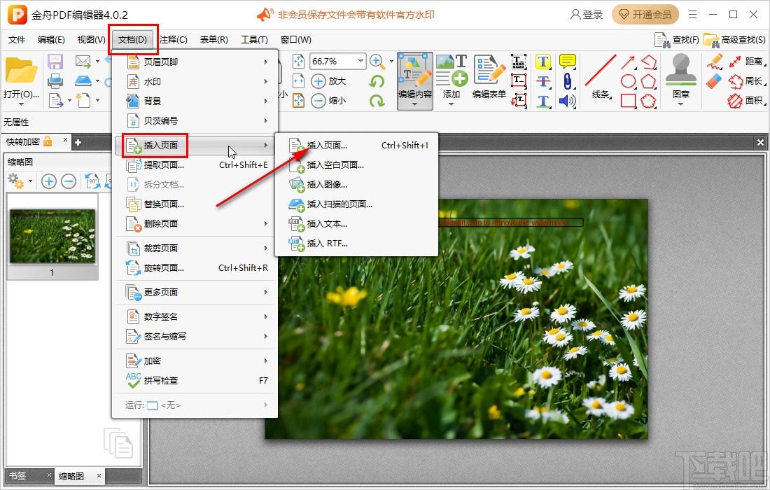 3.点击添加好PDF文件之后,在界面的左上方找到文档这个选项,点击之后在出现的菜单中找到插入页面这个选项之后点击右边子菜单中的插入页面。