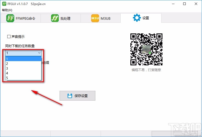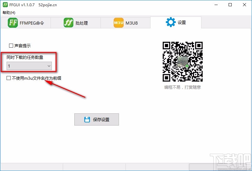 FFGUI是一款专业优秀的m3u8下载软件,该软件界面清爽大方,用户使用这款软件,不仅可以下载m3u8,而且还能对视频进行无损转码,功能十分强大。这款软件默认同时下载任务数是1,因此有很多朋友使用这款软件批量下载m3u8文件的时候,会觉得这款软件下载的速度比较慢。针对这样的问题,我们可以在软件中设置同时下载任务数量。鉴于很多新手朋友不会对其操作,那么接下来小编就给大家详细介绍一下FFGUI设置同时下载任务数的具体操作方法,有需要的朋友可以看一看并收藏起来。