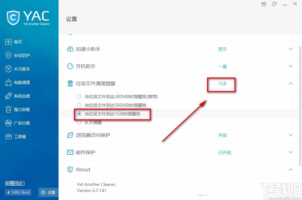5.比如小编在上一步中选择“当垃圾文件到达1GB时提醒我”选项,然后在“垃圾文件清理提醒”选项后面显示的就是1GB,如下图所示,大家可以作为参考。
