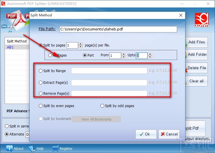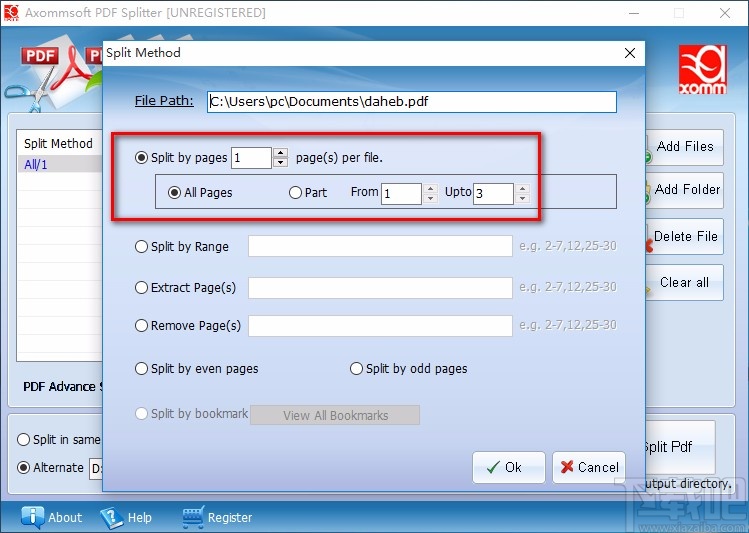 4.在窗口中可以找到“Split by pages”选项,该选项表示每几页分割为一个文件,其后面有一个文本框,可以在文本框中输入具体的页数;其下方还有“All Pages”和“Part”选项,分别表示所有页面和部分的意思;根据自己的需要选择;如果选择后者,则还要在文本框中输入对应的数值。