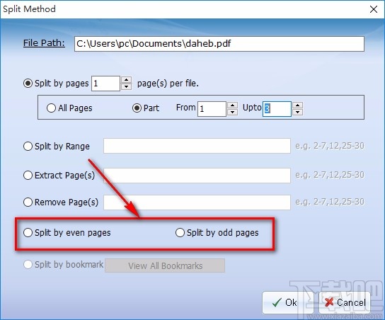 6.接下来在窗口中还能找到“Split by even pages”和“Split by odd pages”选项,分别表示按偶数页分割、按奇数页分割的意思,根据自己需要进行选择,并点击窗口底部的“OK”按钮返回主界面。