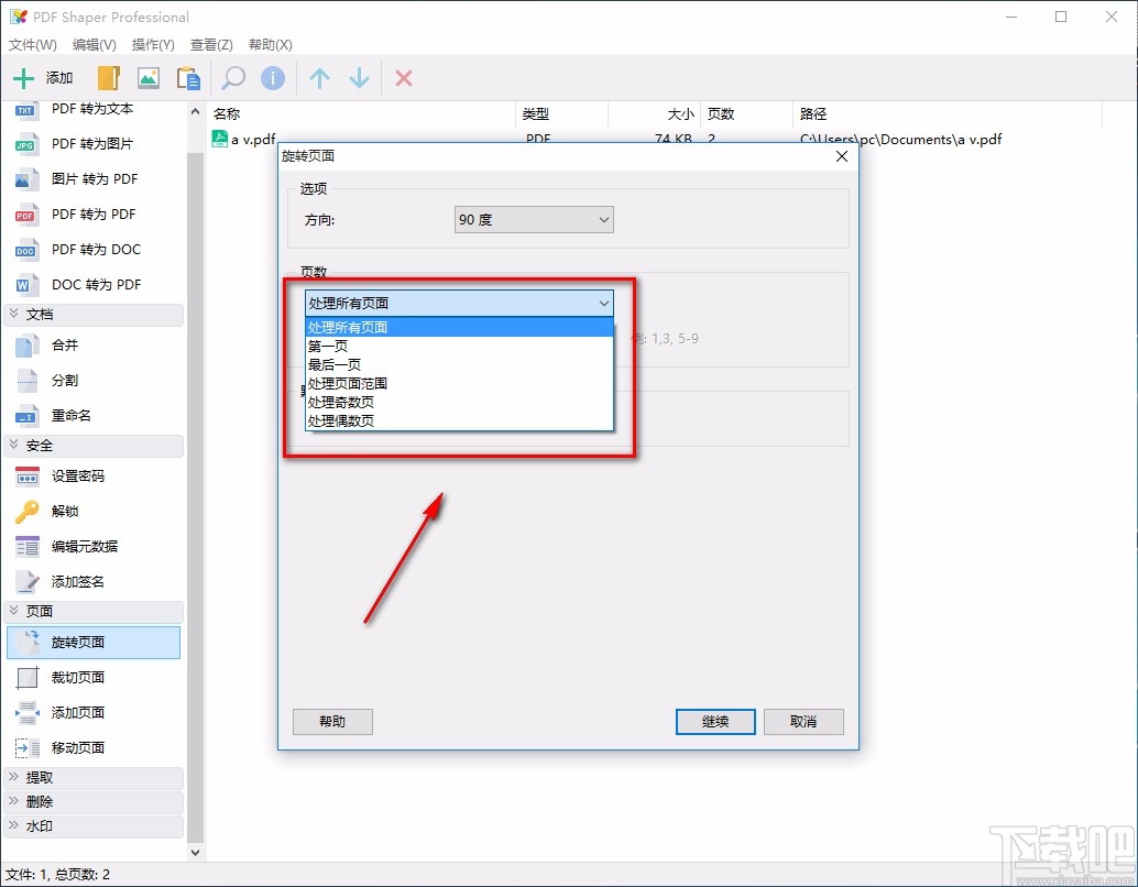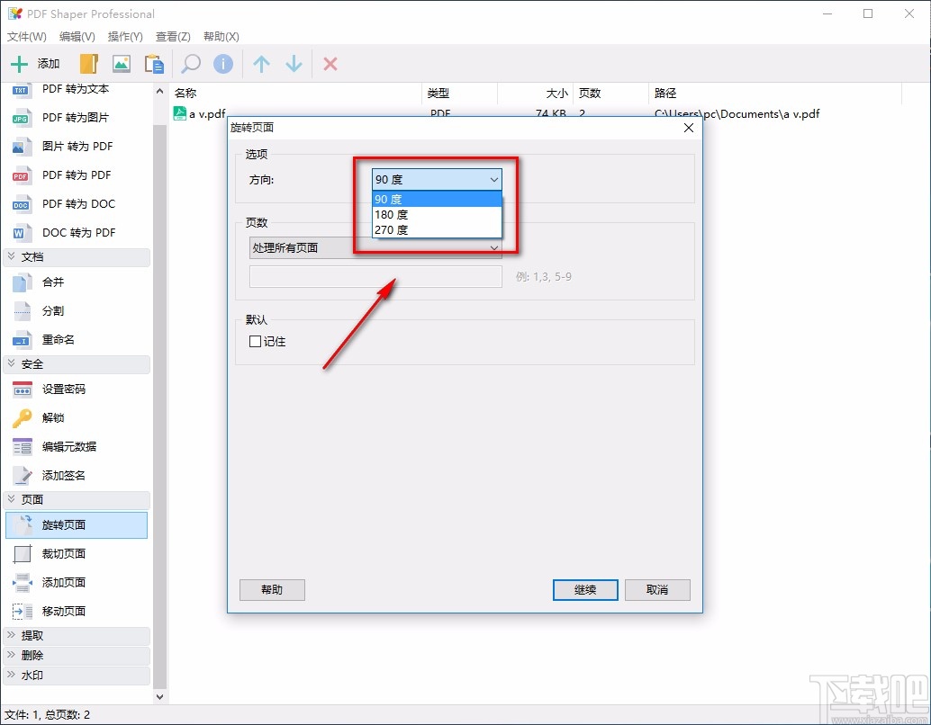 3.将PDF文件添加到软件后,界面上会出现一个旋转页面窗口,我们在窗口找到“方向”选项,点击该选项后面的下拉按钮,在下拉框中设置旋转角度。