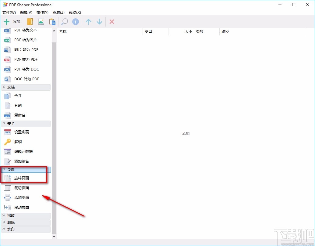 1.首先打开软件,我们在界面左侧点击“页面”选项,其下方就会出现一个下拉列表,在下拉列表中选择“旋转页面”选项。