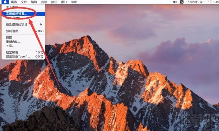 2.接着点击桌面左上角的苹果图标按钮,其下方会出现一个下拉框,我们在下拉框中选择“系统偏好设置”选项。