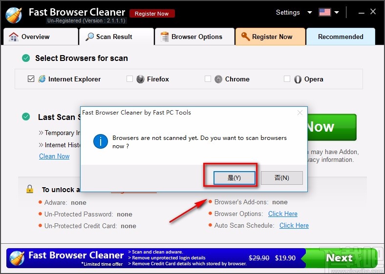 3.接着界面上就会出现一个是否确认扫描提示窗口,我们直接点击窗口右下角的“是”按钮就可以开始扫描浏览器。
