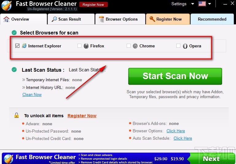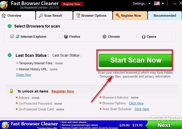 2.选择好需要扫描的浏览器后,我们在界面上找到绿色的“Start Scan Now”按钮,点击该按钮就可以了。
