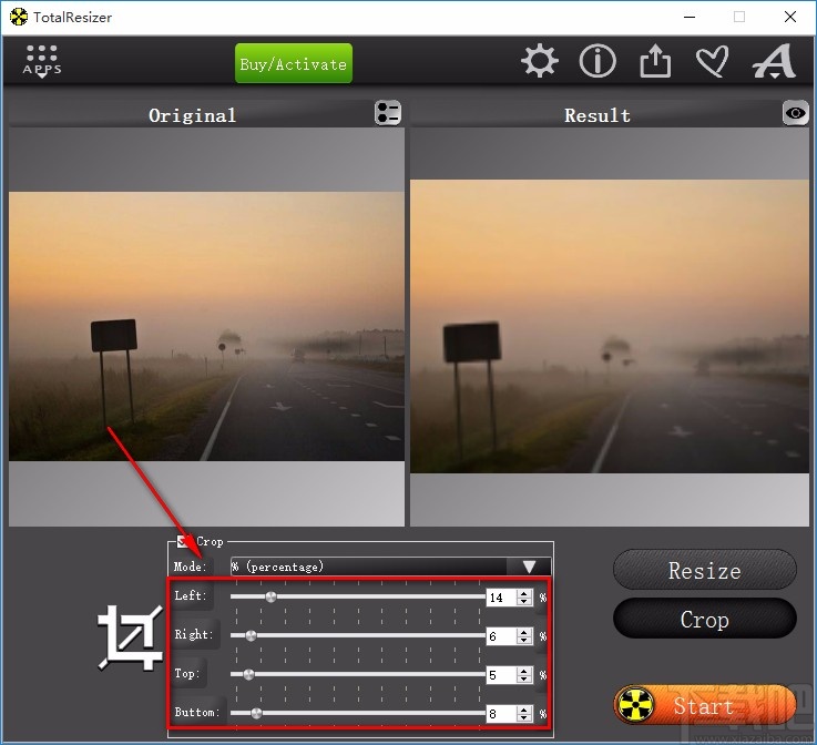 5.接下来在界面下方找到“Left”、“Right”、“Top”、“Buttom”选项,分别表示左边距、右边距、上边距、下边距的意思,分别拖动几个选项后面的小圆光标就可以裁剪图片;或者在几个选项后面的文本框中输入尺寸数值也能达到裁剪图片的目的。