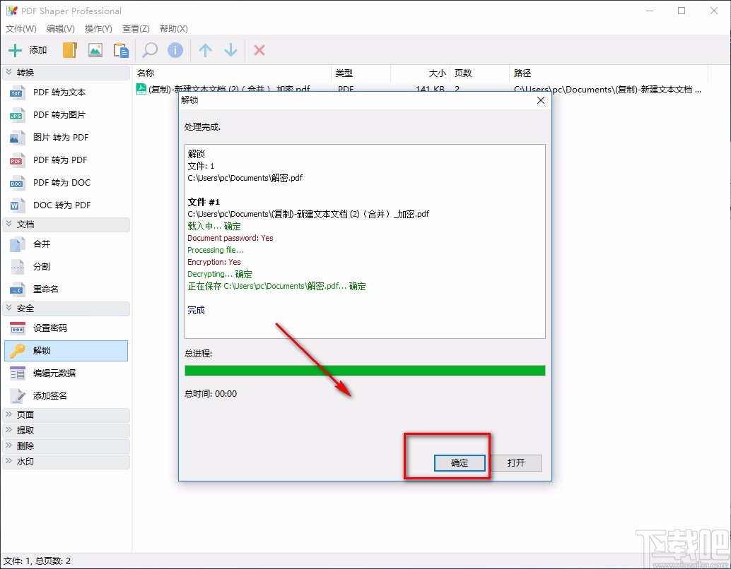6.文件解密成功后,界面上会出现一个解锁窗口,窗口提示我们成功解密PDF文件,这时候点击界面右下角的“确定”按钮就可以了。