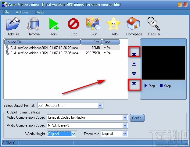 6.此外,我们在文件列表的右侧可以找到两个上移、下移按钮,分别点击这两个按钮就可以调整视频合并的顺序。