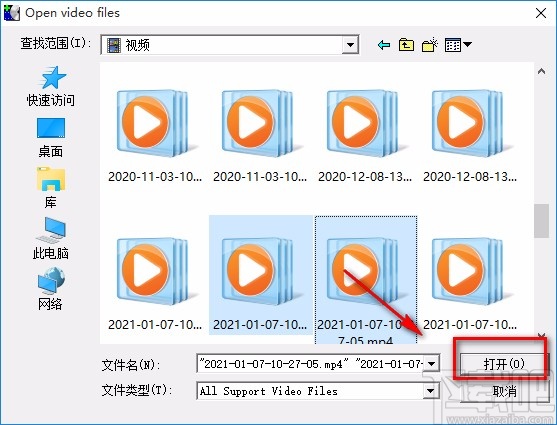 2.接着在文件添加页面中,我们将需要合并的视频选中,再点击页面右下角的“打开”按钮就可以了。