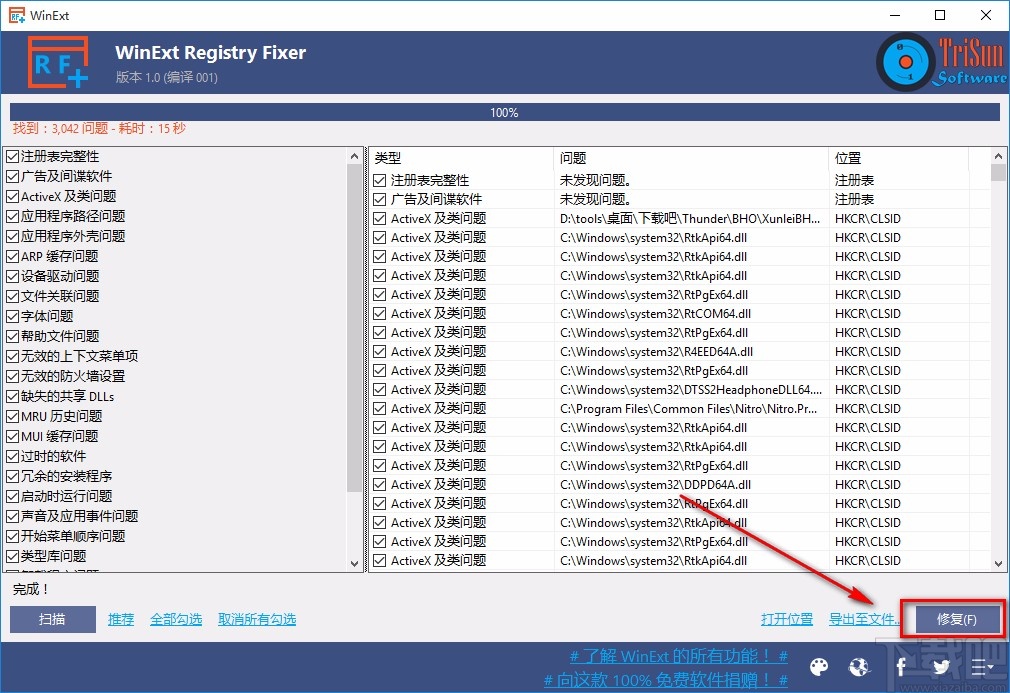 5.勾选好要修复的注册表后,我们在界面右下角找到“修复”按钮,点击该按钮就可以开始修复注册表了。