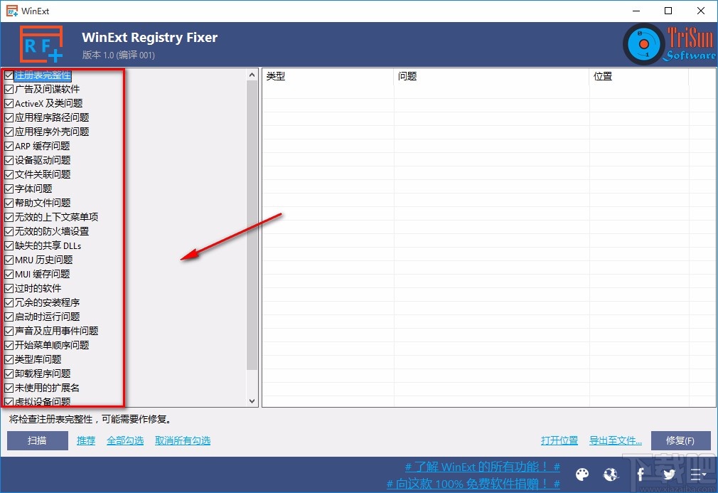 1.首先打开软件,我们在界面左侧可以看到电脑中存在的所有注册表问题,根据自己的需要勾选需要扫描的问题即可。