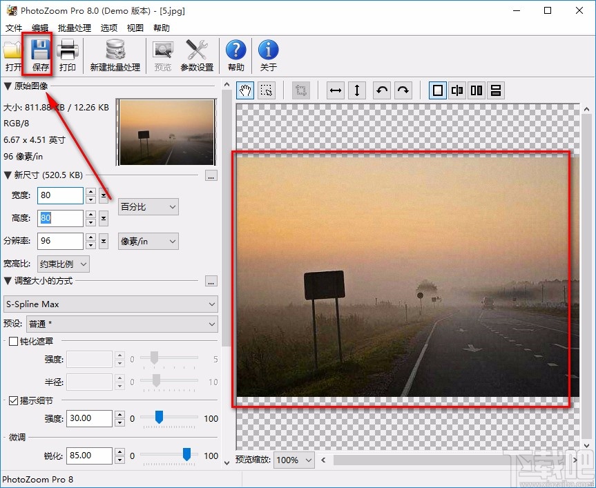 7.完成以上步骤后,我们在界面右侧就可以看到调整大小后的效果图,这时候点击界面左上角的“保存”按钮即可。