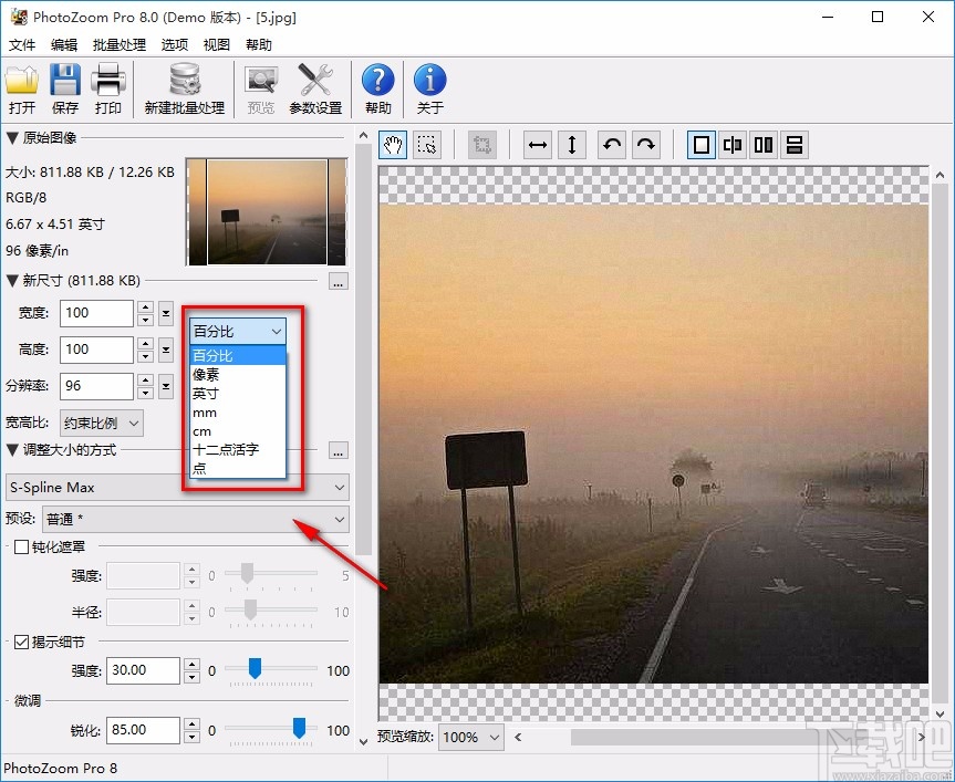 3.将图片添加到软件后,我们在界面左侧找到“百分比”下拉按钮并点击,在下拉框中设置尺寸单位。
