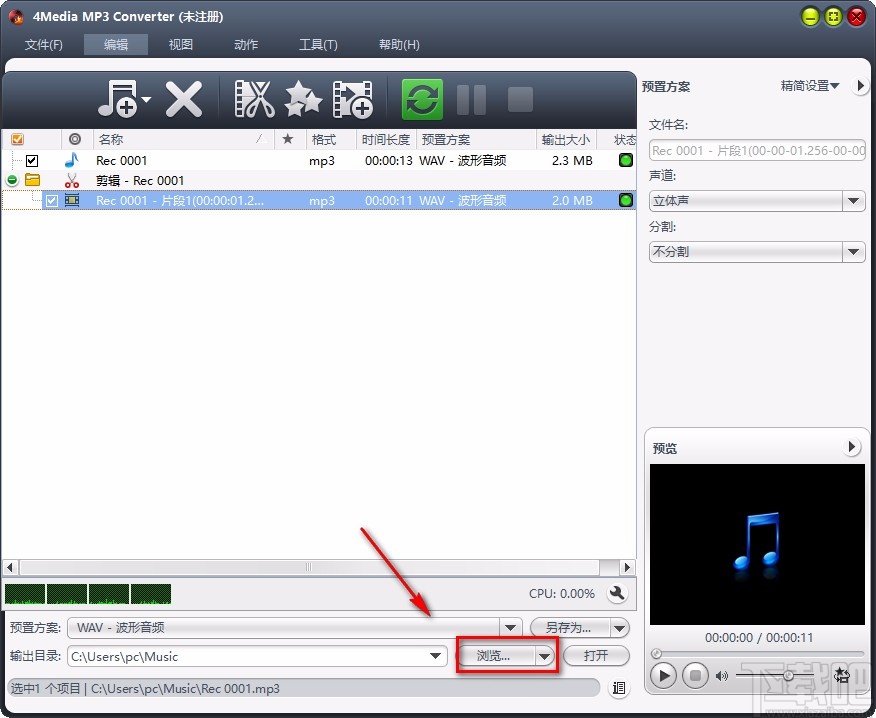 7.在界面底部还能找到一个“浏览”按钮,我们点击该按钮即可打开浏览文件夹窗口设置音频的输出格式。
