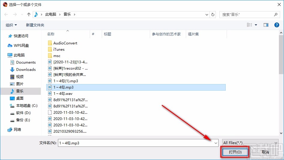 2.在文件添加页面中,我们将需要添加效果的音频文件选中,再点击页面右下角的“打开”按钮就可以了。