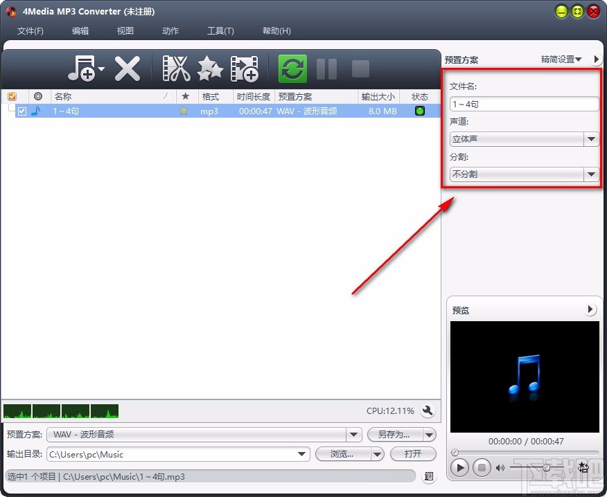 6.返回到软件主界面后,我们在界面右上方找到“文件名”、“声道”、“分割”几个选项,根据自己的需要设置这几个参数。