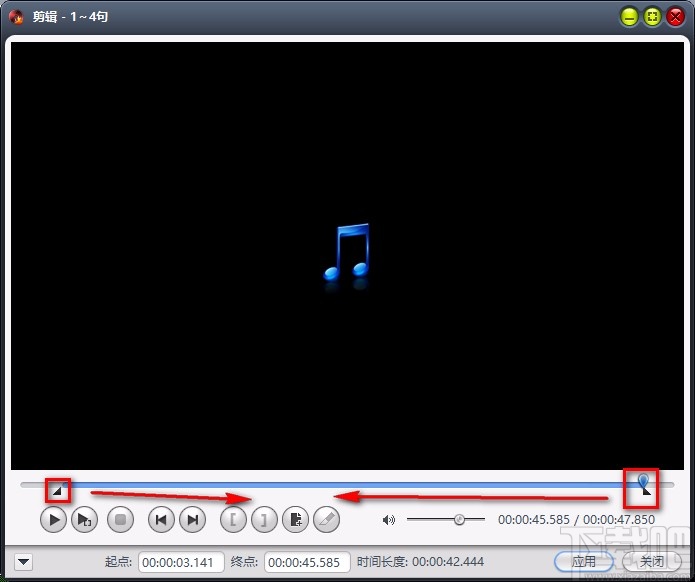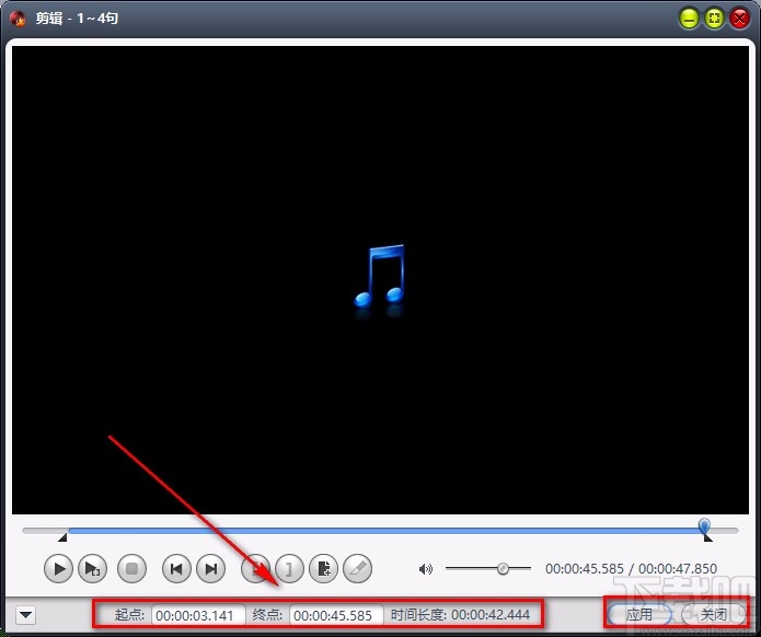 5.然后在窗口底部就可以看到音频剪切的起点、终点以及时间长度,这时候依次点击窗口右下角的“应用”、“关闭”按钮即可。
