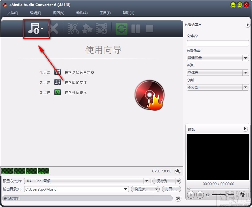 6.随后就可以返回到主界面,我们在界面左下方找到“预置方案”选项,点击其后面的下拉按钮,并在下拉框中设置音频的输出格式。