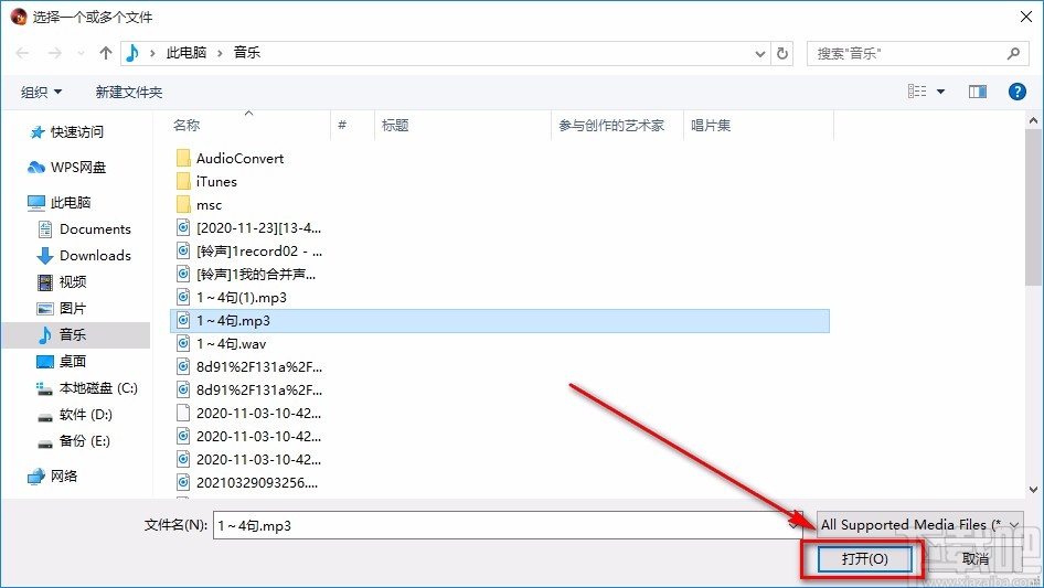 2.接着在文件添加页面中,我们将需要进行剪切操作的音频选中,再点击页面右下角的“打开”按钮即可。