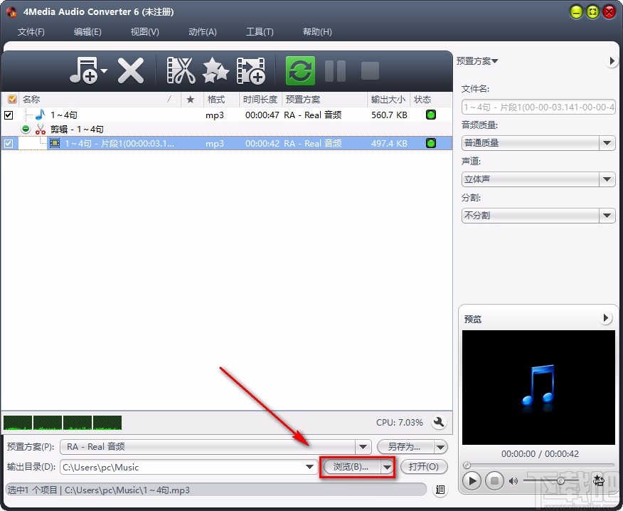 7.接下来在界面底部可以找到“浏览”按钮,我们点击该按钮就可以打开浏览文件夹窗口设置音频的保存位置。