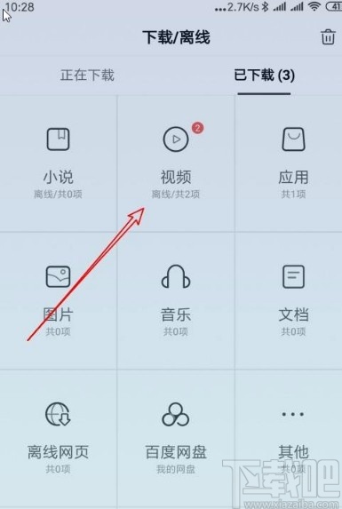 4.接下来在下载/离线页面中,我们在页面上找到“视频”选项,点击这个选项就可以进行下一步操作。