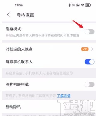 4.然后在隐私设置页面中,我们在页面上方找到“隐身模式”选项,其后面有一个开关按钮,如下图所示。