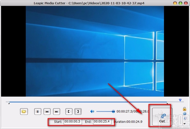 5.完成以上所有步骤后,我们在界面下方就可以看到视频剪切的开始时间、结束时间以及时长,如下图所示;这时候再点击界面右下角的“Cut”按钮。