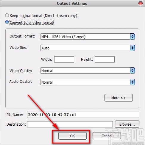9.之后在窗口底部找到“OK”按钮,我们点击该按钮就可以开始剪切视频了,如下图所示。