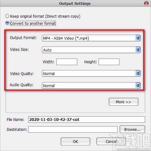 7.如果在上一步中选择转换为其他格式选项,则点击“Output Format”选项后面的下拉按钮设置输出格式;并根据自己的需要对视频尺寸、视频质量以及音频质量等参数进行设置。