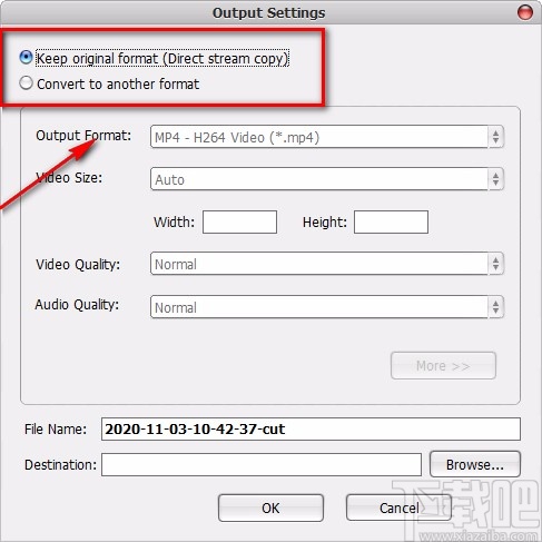 6.接下来界面上就会出现一个输出设置页面,我们在页面上方可以看到下图中红色框圈起来的两个选项,分别表示保持原格式、转换为其他格式的意思,根据自己的需要进行选择。