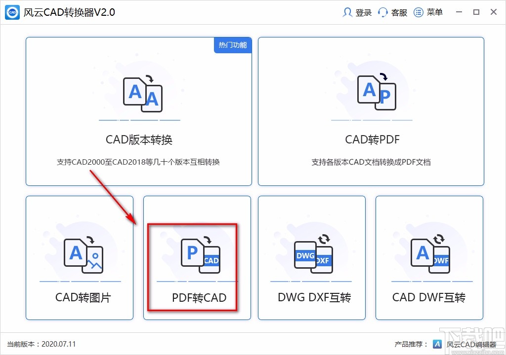 1.首先打开软件,我们在界面上找到“PDF转CAD”选项,点击该选项就可以切换到PDF转CAD页面。