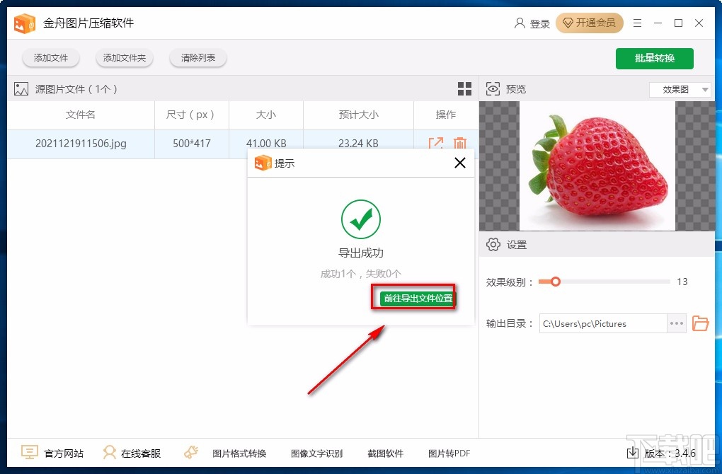 7.图片压缩的速度非常快,压缩成功后,界面上会出现一个导出成功的提示窗口,我们直接点击窗口右下角的“前往导出文件位置”按钮即可查看压缩后的图片。