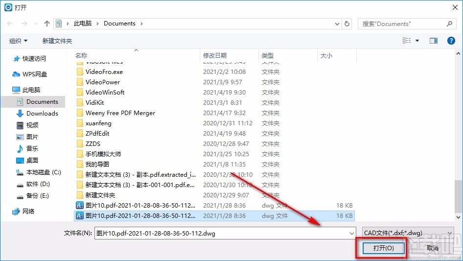 3.在文件添加页面中,我们将需要转换版本的CAD文件选中,再点击页面右下角的“打开”按钮就可以了。