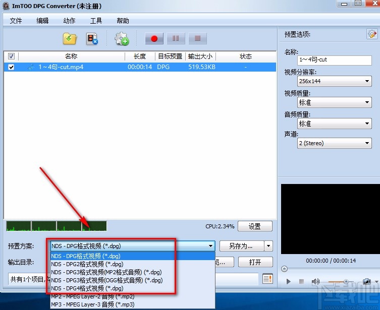 4.然后在界面下方找到“预置方案”选项,我们点击该选项后面的下拉按钮,再根据自己的需要在下拉框中设置具体的DPG格式。