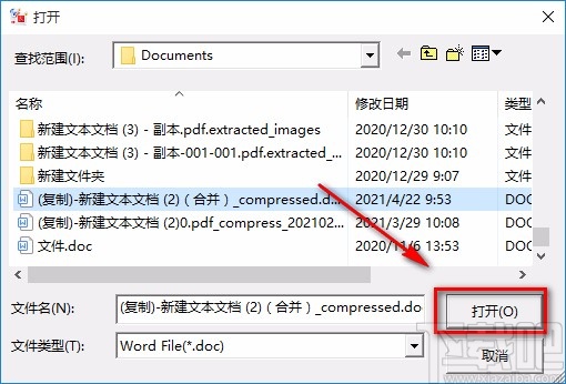 2.接着在文件添加页面中,我们将需要转换格式的word文件选中,再点击页面右下角的“打开”按钮就可以了。