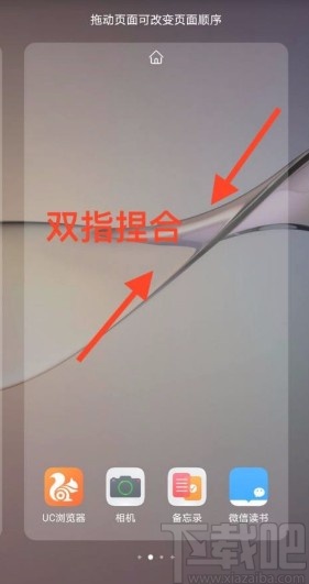 1.首先打开手机,我们在手机桌面用双指向中间捏合,这样就可以进入到桌面管理页面。