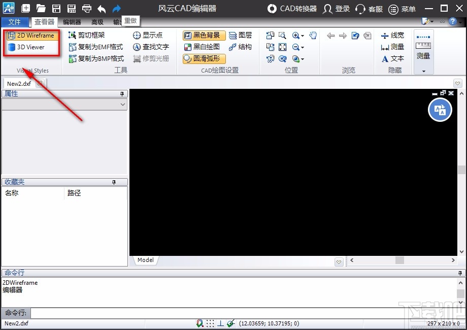 2.接着在界面左上角可以看到“2D Wireframe”和“3D Viewer”两个选项,分别表示2D显示模式和3D显示模式,根据自己的需要点击这两个选项即可。