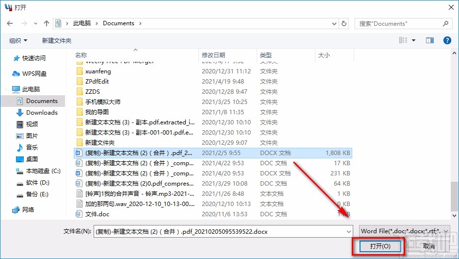 2.接着在文件添加页面中,我们将需要转为PDF的word文件选中,再点击页面右下角的“打开”按钮即可。