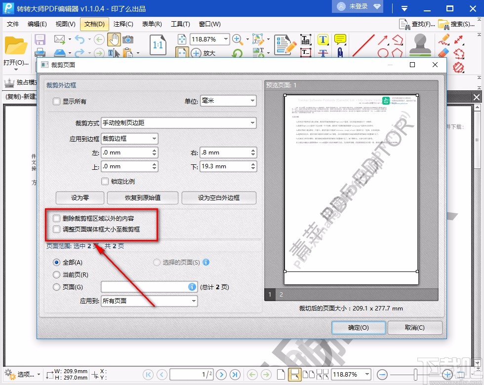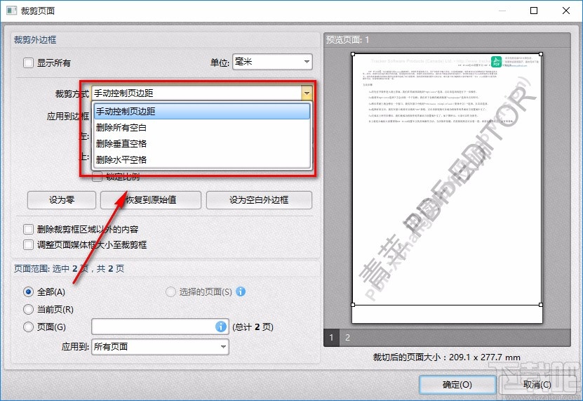 3.接着在下拉框中选择“裁剪页面”选项,其旁边会出现一个子下拉框,我们在子下拉框中选择“裁剪页面”选项。