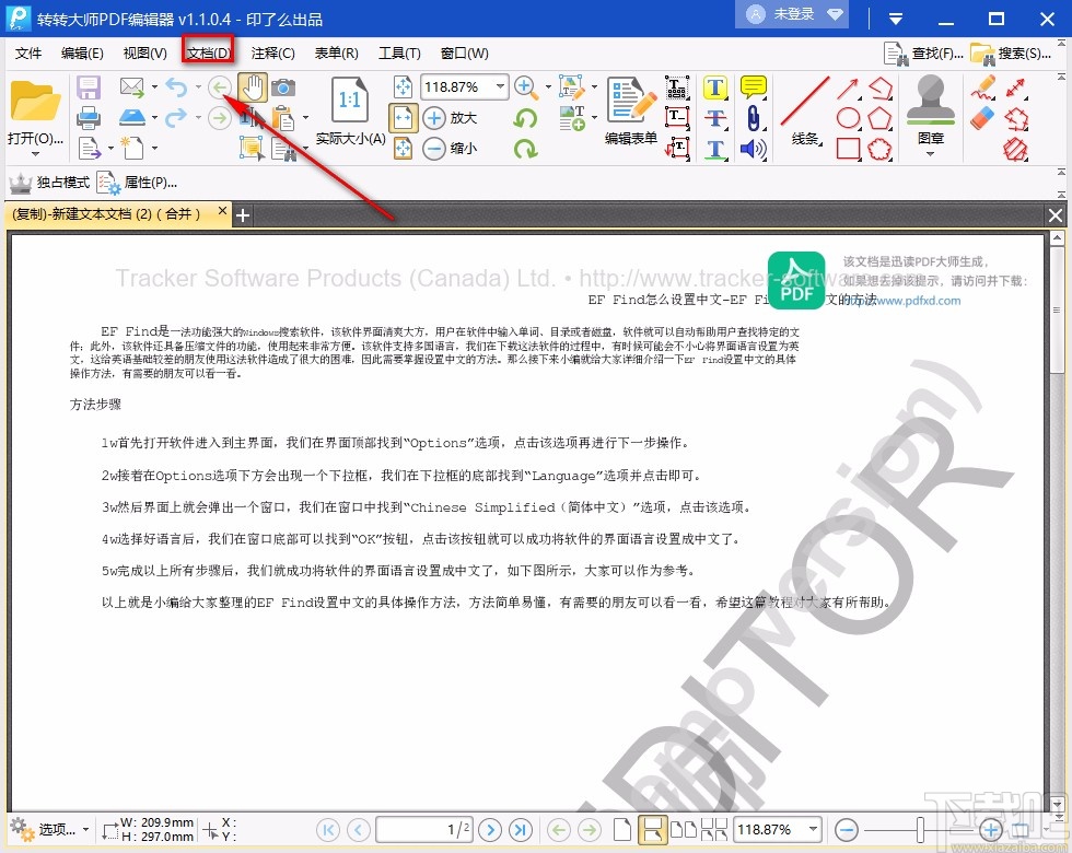 2.将文件添加到软件后,我们在界面上方找到“文档”选项,点击该选项后,其下方就会出现一个下拉框。