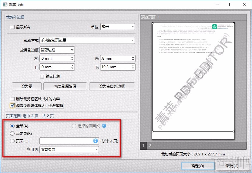 5.如果在上一步中选择“手动控制页边距”选项,则在窗口右侧的预览页面框中会出现一个裁剪框,我们拖动框四周的小矩形就可以调整裁剪框的大小。