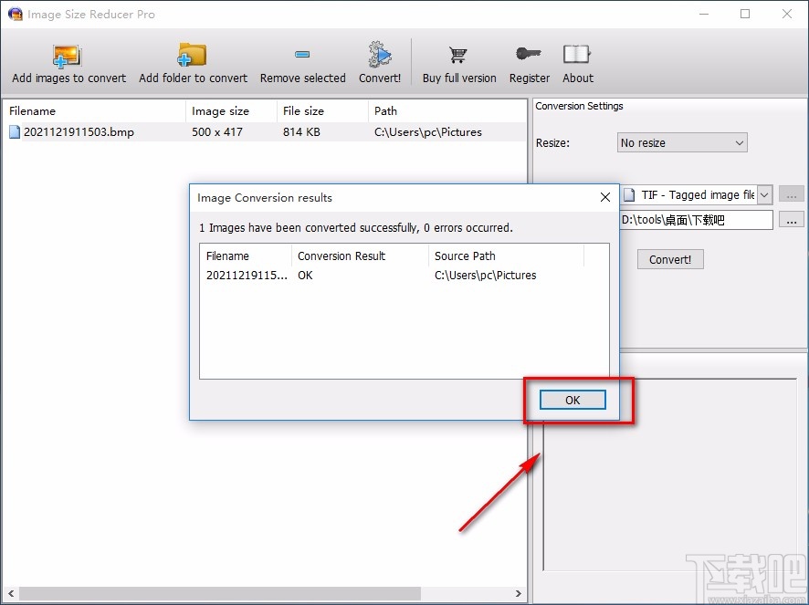 7.图片格式转换完毕后,界面上会出现一个完成提示窗口,这时候我们直接点击窗口右下角的“OK”按钮就可以了。