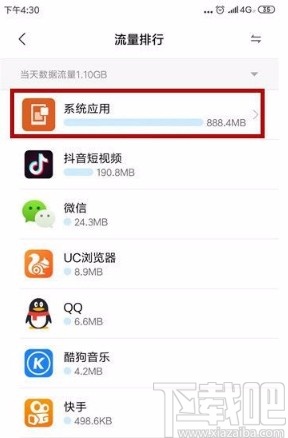 3.然后就会进入到流量排行页面,在页面上可以看到手机中各大软件的流量使用情况,这时候点击“系统应用”选项即可。