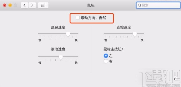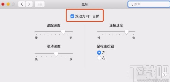 4.随后界面上就会出现一个鼠标窗口,我们在窗口中找到“滚动方向:自然”选项,如果不勾选该选项,此时将鼠标滚轮向上滑动时,页面也会向上滑动;将鼠标滚轮向下滑动时,页面会随之向下滑动。