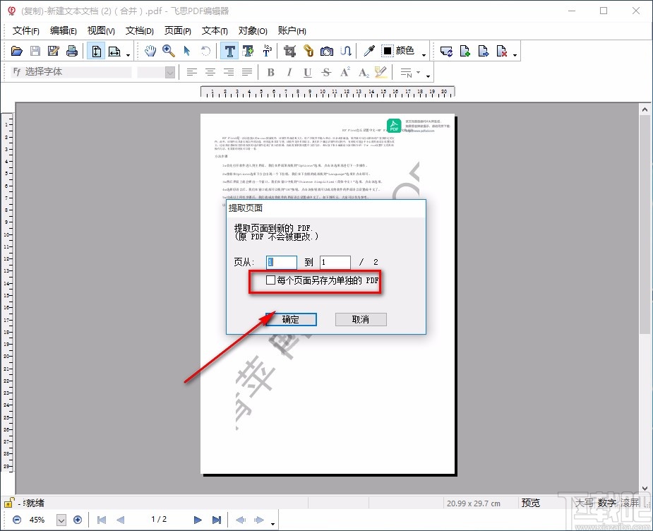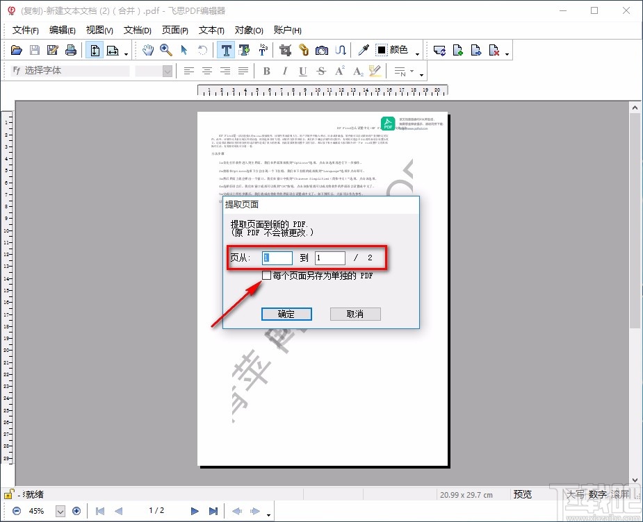 5.如果想要将提取的每个页面单独存为一个PDF文件,就可以在窗口中勾选“每个页面另存为单独的PDF”选项。
